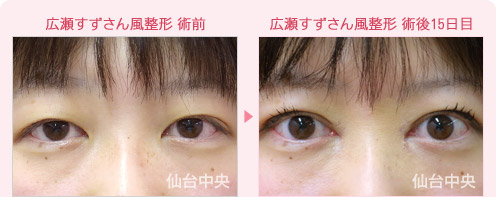 目が小さくて印象が悪いために、アイプチを長期に使用していた症例です。透明感のある明るい表情の広瀬すずさんに憧れて仙台中央クリニックを受診していただきました。目の開きが悪く暗い表情で、上まぶたはかぶれて、厚くガサガサになっていました。明るく元気な広瀬すずさんを目指して美容整形を行いました。素敵な透明感のある笑顔になり、友人にも好評のようです。
